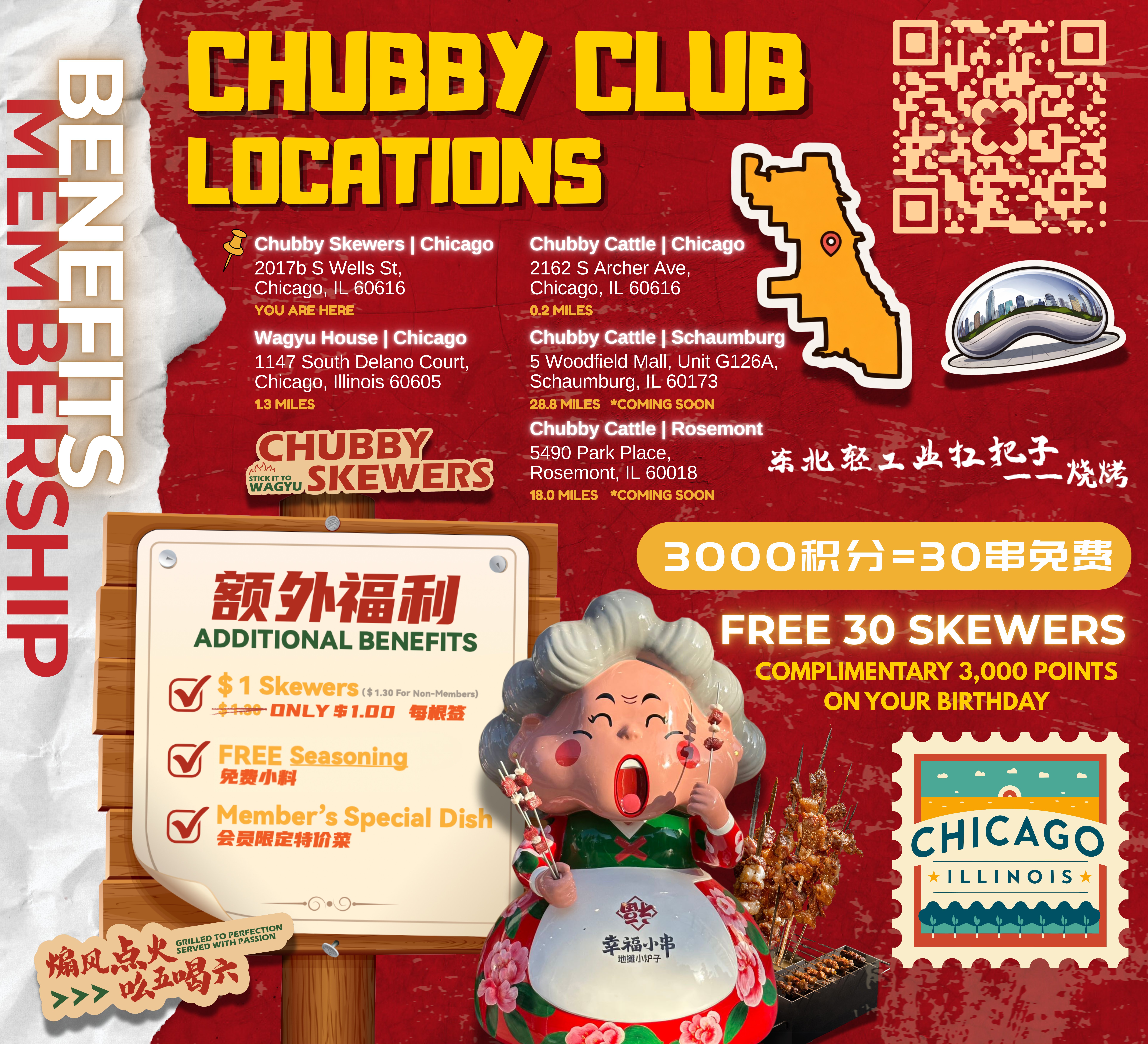 Chubby Skewers Chicago offers a Dongbei-style Chinese barbecue experience inspired by Northeastern street food. Guests can build their own skewers from premium meats like Japanese A5 Wagyu, Masami American Wagyu, and Australian Wagyu, alongside chicken wings, duck tongue, seafood, and seasonal vegetables. Hot and cold dishes, including mala tang, sizzling tofu, and spicy cold noodles, round out the menu. With a lively, retro street-market atmosphere, Chubby Skewers delivers bold flavors, shared dining, and a spirited late-night vibe.