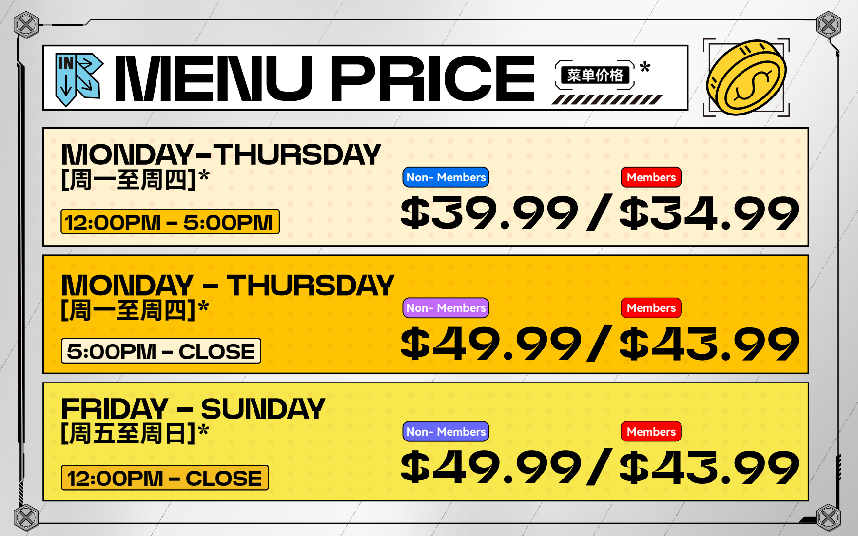 Last seating is 60 minutes before closing